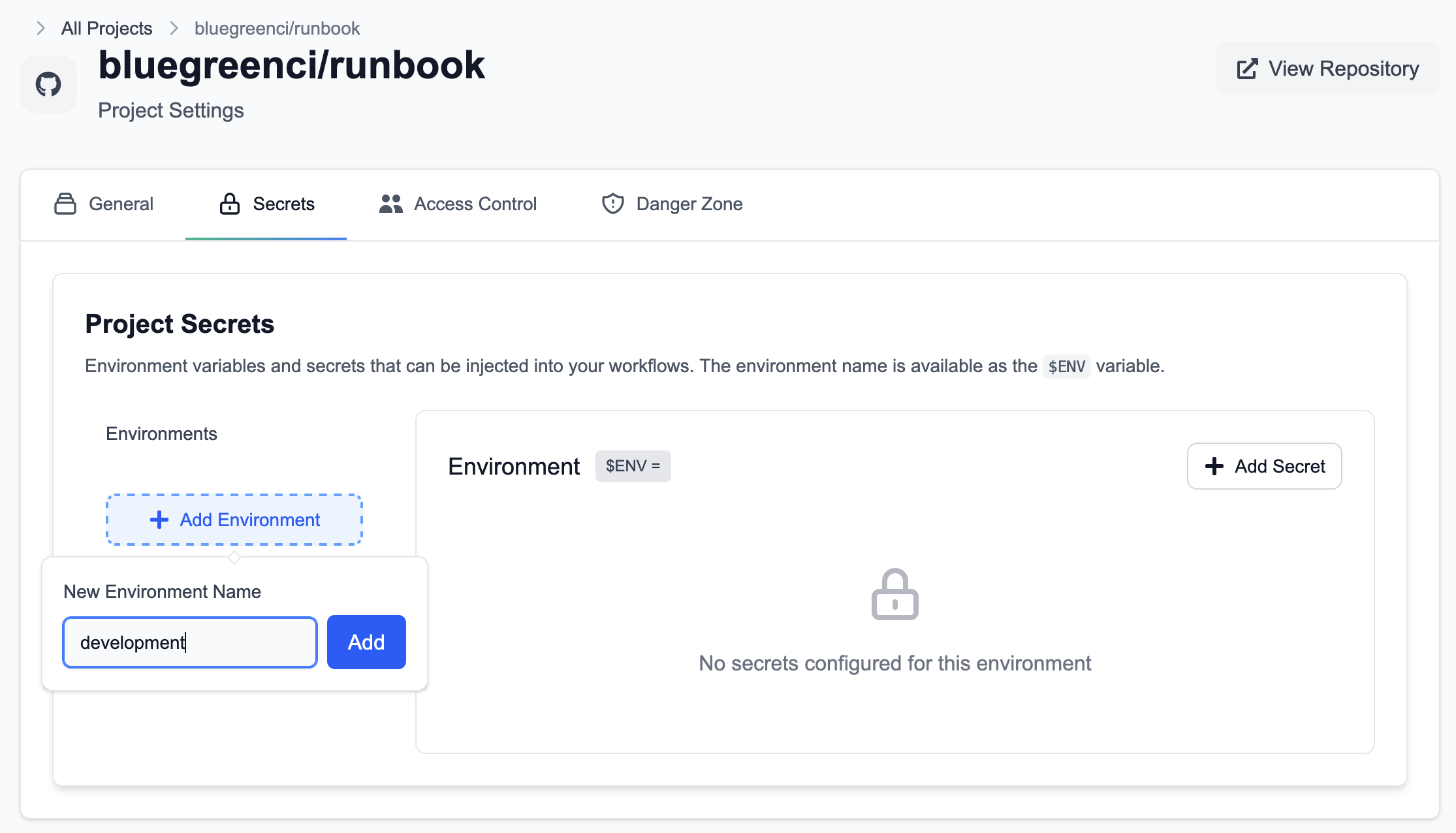 Open Project → Settings → Secrets to create environments and add secrets. For example, create an environment named development and add secrets scoped to it.
